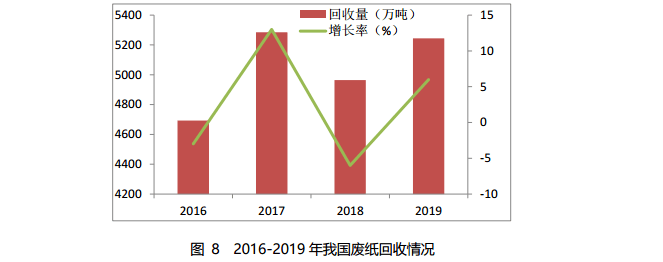 2019 年,我國廢紙回收量約 5244 萬噸,同比增長5.6%,廢紙回收率為 49.0%,廢紙利用率為 58.3%。在固體廢物進口政策影響下,進口廢紙量持續(xù)下滑,國內(nèi)廢紙回收量呈上升趨勢。2016-2019 年我國廢紙回收情況如圖 8 所示。
