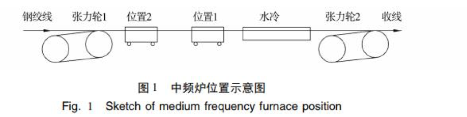 預(yù)應(yīng)力混凝土鋼絞線生產(chǎn)中,鋼絞線穩(wěn)定化處 理生產(chǎn)線使用的中頻感應(yīng)加熱爐為移動(dòng)式( 如圖 1 所示) 。生產(chǎn)線停止運(yùn)行時(shí)中頻感應(yīng)加熱爐處于位 置 1,生產(chǎn)線啟動(dòng)運(yùn)行時(shí)中頻感應(yīng)加熱爐由位置 1 向與穩(wěn)定化處理鋼絞線反方向移動(dòng)至位置 2,生產(chǎn) 結(jié)束時(shí)中頻感應(yīng)加熱爐由位置 2 移動(dòng)至位置 1。正 常生產(chǎn)中鋼絞線經(jīng)中頻感應(yīng)加熱爐加熱后進(jìn)入生產(chǎn) 線冷卻水槽( 圖 2) 冷卻,再經(jīng)壓縮空氣吹干。生產(chǎn) 線停止運(yùn)行時(shí),在中頻感應(yīng)加熱爐由位置 2 移動(dòng)至 位置 1 過程中,其兩端自帶的冷卻與吹干裝置自動(dòng)啟動(dòng),對(duì)位置 2 與生產(chǎn)線冷卻水槽之間的部分鋼絞 線進(jìn)行冷卻、吹干處理,從而使這部分鋼絞線與正常 生產(chǎn)的鋼絞線性能一致,以降低消耗,提高鋼絞線的 成材率。
