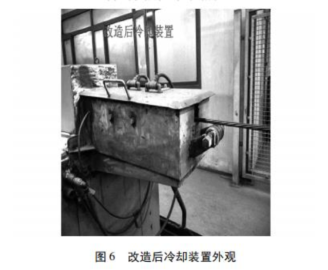 針對(duì)原中頻爐冷卻裝置存在的缺陷,經(jīng)過研究 并結(jié)合多年的設(shè)備、生產(chǎn)及工藝方面的相關(guān)經(jīng)驗(yàn),設(shè) 計(jì)出全新的 V 型直冷式可控大流量冷卻裝置。改 造后冷卻裝置內(nèi)部結(jié)構(gòu)如圖 5 所示,冷卻裝置外觀 如圖 6 所示。 改造后的冷卻裝置特點(diǎn): ( 1) 新裝置采用加長(zhǎng) V 型水槽儲(chǔ)水冷卻,水槽將原來冷卻水管道直徑由 10 mm 增加到 16 mm,冷 卻水的供給量增大了 2. 5 倍。因?yàn)?V 型水槽容積 小能使冷卻水充分快速流動(dòng)而帶走大量熱量,同時(shí) 由于儲(chǔ)水式冷卻能使鋼絞線始終浸泡在冷卻水中, 增大了冷卻的面積,只需一次冷卻即可將鋼絞線冷 卻至60 ℃以下,保證了冷卻的效果。 ( 2) 在冷卻裝置中加裝了導(dǎo)線輥,當(dāng)生產(chǎn)線停 止運(yùn)行時(shí),中頻爐由位置 2 向位置 1 移動(dòng)過程中,導(dǎo) 線輥與導(dǎo)線輪對(duì)下垂的鋼絞線起到支撐,避免鋼絞 線懸空,使鋼絞線不與噴氣吹干部分及 V 型冷卻水 槽接觸,不會(huì)對(duì)冷卻水槽產(chǎn)生磨損。 ( 3) 新的冷卻裝置與吹干裝置不會(huì)堵塞,完全 能在高溫、高油煙環(huán)境下正常工作,無需清理新的冷卻裝置與吹干裝置使用效果良好,適合所有規(guī)格鋼絞線的生產(chǎn)。改造成本低,使用壽命長(zhǎng)。 既避免了鋼絞線整根斷裂,又消除了安全隱患,實(shí)現(xiàn) 了無人化操作,提高了鋼絞線的成材率和勞動(dòng)生 產(chǎn)率。
