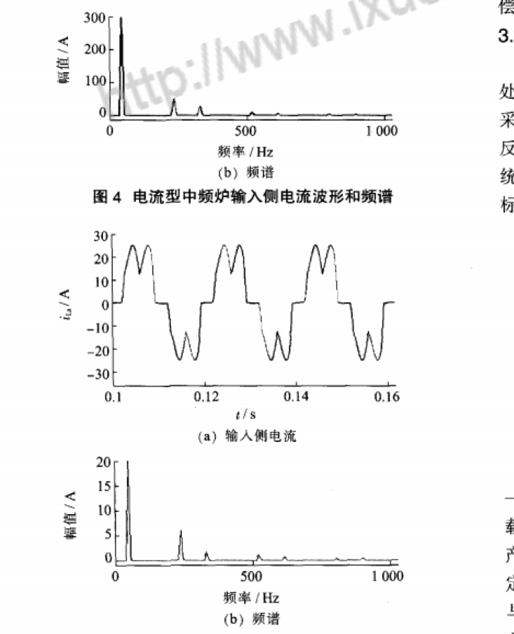 利用PSIM軟件分別建立電流型中頻爐和電壓型中頻爐的仿真模型.其結(jié)構(gòu)如圖2和圖3所示電流型中頻爐逆變側(cè)由4個(gè)晶閘管橋臂組成.電壓型中頻爐逆變側(cè)由4個(gè)IGBT組成將中頻爐加熱頻率設(shè)為1000Hz,中頻爐額定功率P為100kW.電源電壓為220V。根據(jù)所建仿真模型.得到中頻爐的輸人諧波特性:電流型中頻爐輸入側(cè)a相電網(wǎng)電流波形和頻譜如圖4所示.電壓型中頻爐輸人側(cè)a相電網(wǎng)電流波形和頻譜如圖5所示