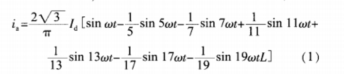 中頻電源注入電網(wǎng)的諧波主要是由整流裝置產(chǎn)生的.這里以三相6脈動全控橋式整流電路為例來分析其諧波含量忽略三相橋式晶閘管整流電路換相過程和電流脈動.假定交流側(cè)電抗為0.直流電感為無窮大,利用傅里葉分析方法,將電流負(fù)、正兩半波的中點(diǎn)作為時(shí)間零點(diǎn),可推出交流側(cè)a相電流的表達(dá)式: