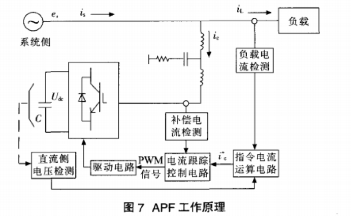 APF的工作原理如圖7所示。指令電流運(yùn)算電路,一方面為達(dá)到消除諧波和補(bǔ)償無功功率的目的,將負(fù)載電流,中的諧波電流和無功電流分離出來,產(chǎn)生調(diào)節(jié)信號;另一方面為保持直流側(cè)電容電壓穩(wěn)定.采用PI調(diào)節(jié)控制法:將檢測到的電容電壓實(shí)際值與給定的參考電壓值相減之差通過PI調(diào)節(jié)器得到調(diào)節(jié)信號,并將作為實(shí)際的補(bǔ)償電流指令值疊加到i。上,即: