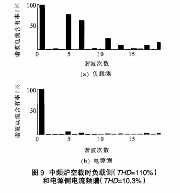 為了使中頻爐產(chǎn)生的諧波對公共電網(wǎng)的影響符合設(shè)備使用地供電系統(tǒng)的要求.可采取積極有效的治理措施以消除諧波污染,具體治理措施如下6]:一是變壓器采用Y/Y/A接線方式對于大容量的中頻爐.其供電變壓器可以采用Y/Y/△接線方式.通過改變整流器交流側(cè)變壓器的接線形式來抵消較低次的特征諧波但成本較高。二是采用LC無源濾波器.主要結(jié)構(gòu)是用電容器與電抗器串聯(lián)起來.組成LC串聯(lián)回路,并聯(lián)于系統(tǒng)中。這種方法比較傳統(tǒng).既可補(bǔ)償諧波,又可補(bǔ)償無功功率.結(jié)構(gòu)簡單,一直被廣泛使用。但補(bǔ)償特性受電網(wǎng)阻抗和運(yùn)行狀態(tài)的影響。易和系統(tǒng)發(fā)生并聯(lián)諧振.且只能補(bǔ)償固定頻率的諧波.補(bǔ)償效果也不甚理想。三是采用APF,這是諧波抑制比較新的方法[7]。APF是一種動態(tài)諧波補(bǔ)償設(shè)備,具有高度可控性和快速響應(yīng)性.能對頻率和幅值都變化的諧波進(jìn)行跟蹤補(bǔ)償.動態(tài)特性好,且補(bǔ)償特性不受阻抗的影響,諧波補(bǔ)償效果最佳.因而受到廣泛重視。
