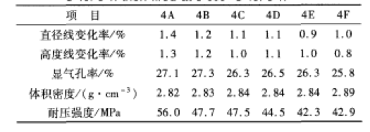 經(jīng)l350oC3h預(yù)燒后的試樣4A-_4F再經(jīng)1600℃3h燒后的性能檢測(cè)結(jié)果見表5。由表5可見,隨復(fù)合促燒劑加入量的減小,試樣的直徑線變化、高度線變化、耐壓強(qiáng)度在逐漸減小,體積密度在逐漸增加。綜合比較而言,試樣4c的強(qiáng)度較高,線變化比較合理,該試樣在1000以下燒后幾乎無強(qiáng)度,呈粉狀,1200oC燒后稍微有點(diǎn)強(qiáng)度,1350oC燒后有一定的強(qiáng)度,1600oC燒后有較高的燒結(jié)強(qiáng)度,可以滿足中頻爐搗打料各方面要求。因此,選擇4c配比作為工業(yè)現(xiàn)場(chǎng)試驗(yàn)用干式搗打料的配比。
