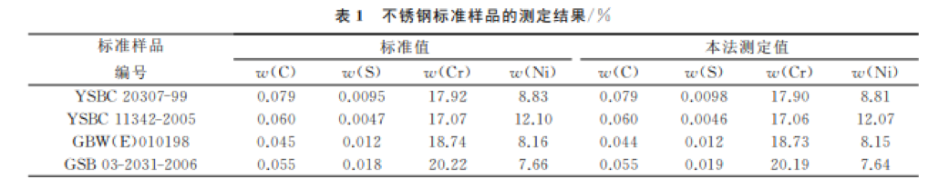 選?。磦€不銹鋼標(biāo)準(zhǔn)樣品,按本方法分析步驟進(jìn)行測定,結(jié)果如表1所示。