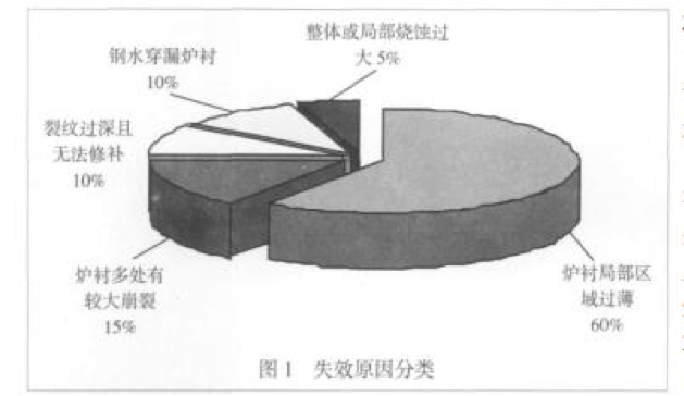 柳工機(jī)械股份有限公司鑄鋼廠每年熔煉鑄鋼鋼 液約 16000t,使用 6t 中頻爐和 3t 電弧爐熔煉碳鋼。長期以來中頻爐使用一家知名的爐襯材 料供應(yīng)商提供的爐襯材料,但一直存在著中頻電爐爐襯壽命 偏短的問題,平均爐襯壽命約 45 爐。爐襯壽命偏短 導(dǎo)致頻繁的修筑爐襯和烘爐,對生產(chǎn)組織和成本控 制都帶來了很不利的影響。為了解決這個問題,從 2008 年 6 月開始,我們開始在延長爐襯壽命方面進(jìn) 行探索。我們首先進(jìn)行了中頻爐煉鋼爐襯的失效原 因分析。 根據(jù)對 2008 年全年筑爐 25 次的失效統(tǒng)計,目 前的中頻電爐爐襯材料最主要缺點(diǎn)是裂紋傾向大,爐襯容易 因裂紋而導(dǎo)致多處崩裂、造成局部區(qū)域過薄而失效; 其次是中頻電爐爐襯下部燒蝕過快導(dǎo)致爐襯失效。失效原因 分類見圖 1。