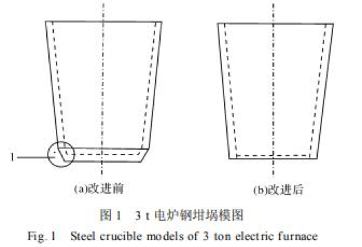 3t中頻爐鋼坩堝模具的原始設計如圖1(a)所示。它是由兩個截短的空心錐體組成的鋼制坩堝模具。這種結構的鋼制坩堝模具在建造熔爐時具有一個缺點,即,(1)部分中的死砂不易結實,并且容易引起鐵水泄漏。改進的鋼制坩堝模具的形狀如圖1(b)所示,它是帶有截頭空心錐的鋼制坩堝模具。這種改進有助于在熔爐制造過程中打結。沒有死角,從根本上解決了原始鋼制坩堝模具的打結(1)不易打結的問題。實踐證明,這種改進是非常成功的,并且是延長爐齡的關鍵之一。
